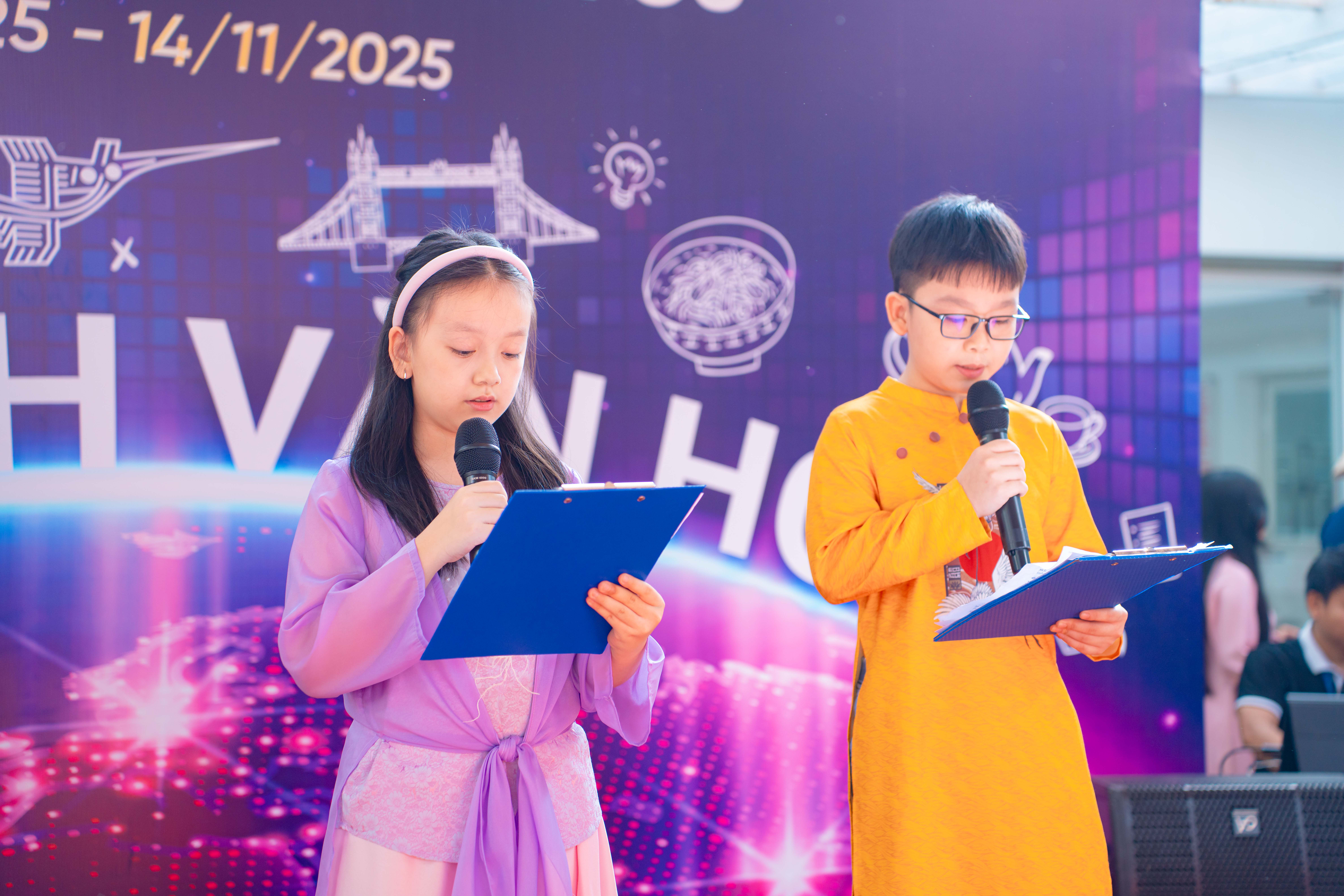 Sân khấu bừng sáng khi các bạn học sinh Tiểu học tự tin sải bước trong những bộ trang phục truyền thống đến từ nhiều quốc gia. Mỗi bộ trang phục là một câu chuyện văn hoá, và mỗi nụ cười là minh chứng cho sự tự tin, khi các em mạnh dạn giới thiệu nét đẹp đặc trưng của từng đất nước trước thầy cô, bạn bè và phụ huynh.